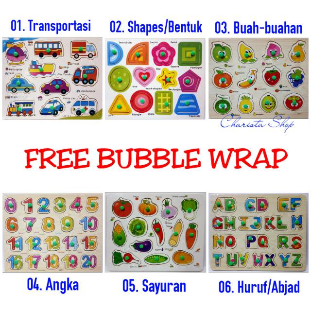 Mainan Puzzle Mencocokkan Bentuk Angka Huruf Buah Binatang Bahan