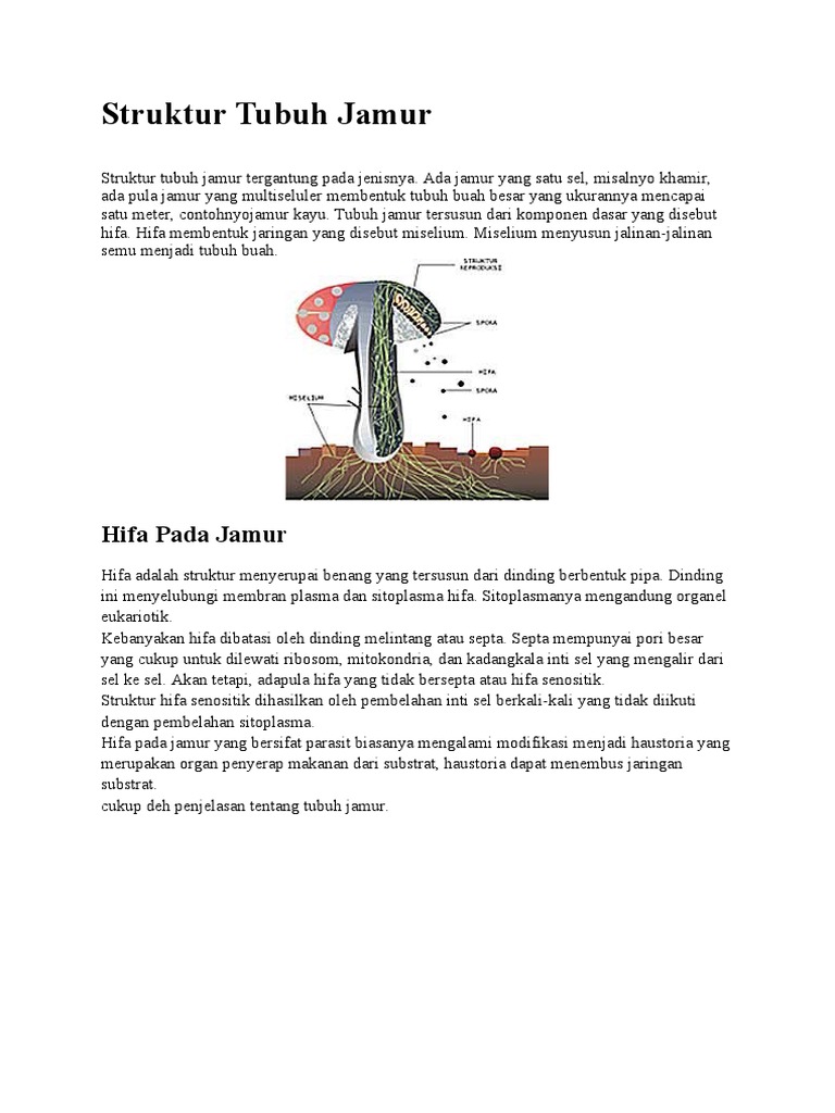 Jamur yang sedang membentuk tubuh buah seperti pada jamur merang disebut cendawan. Struktur tubuh jamur struktur tubuh jamur. Tubuh jamur tersusun dari komponen dasar yang disebut hifa.